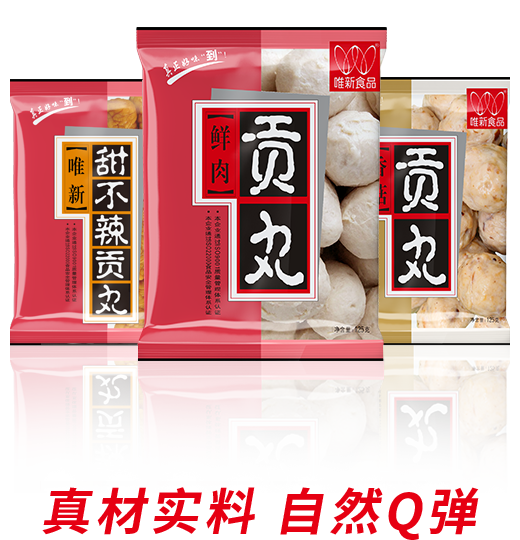 選擇蛋白質(zhì)含量及新鮮度高的豬后腿肉為原料,模擬手工捶打的打漿工藝,再經(jīng)煮制、冷卻、速凍工藝才可生產(chǎn)出自然脆彈的唯新貢丸,是居家佐餐、火鍋的美味食品。近年來(lái)我們還研發(fā)生產(chǎn)了香腸、蝦滑、魚(yú)丸、牛肉丸等大眾喜愛(ài)的家庭火鍋料速凍食品。